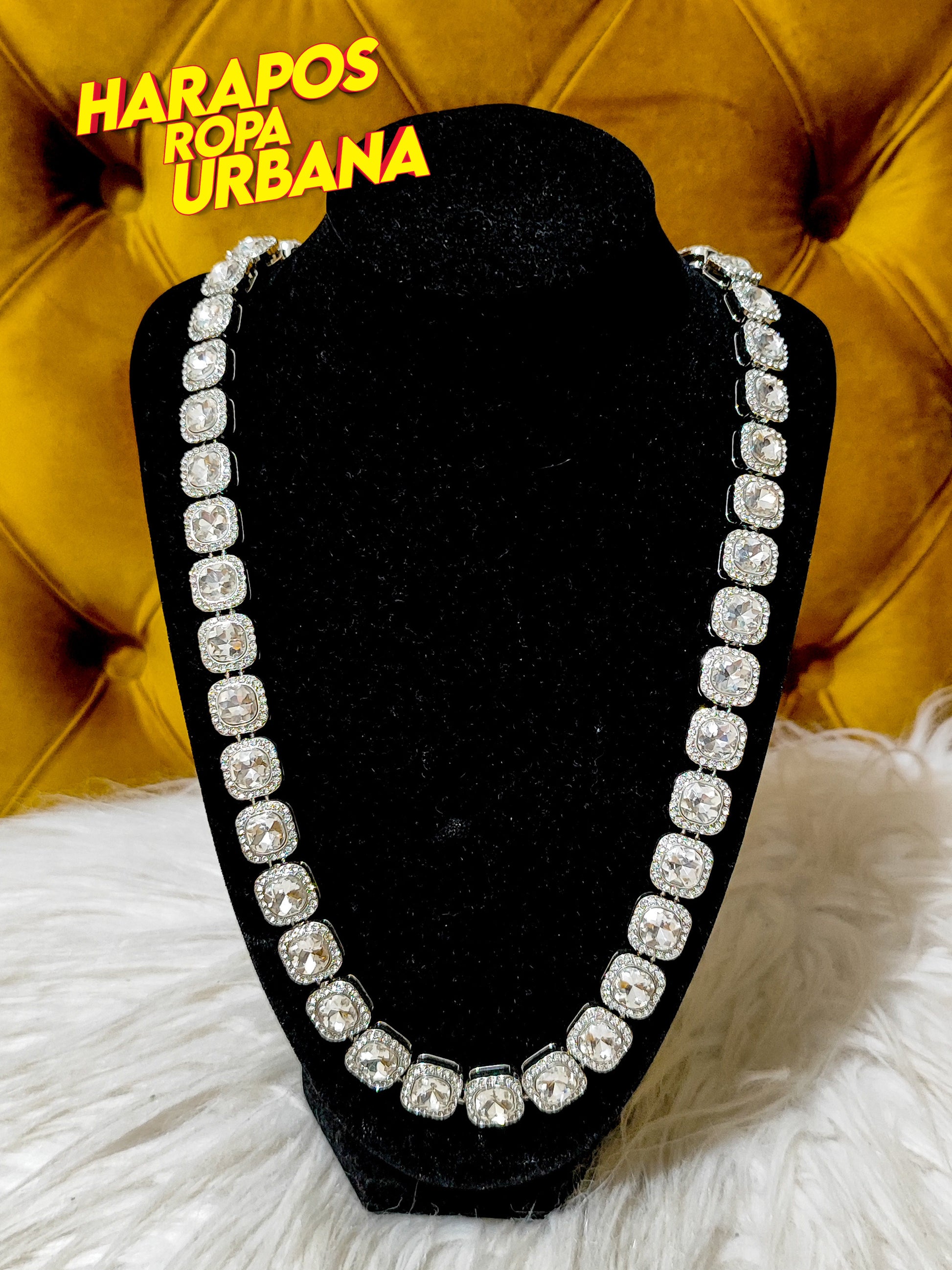 Cadena cubana plateada con eslabones cuadrados con diamantes