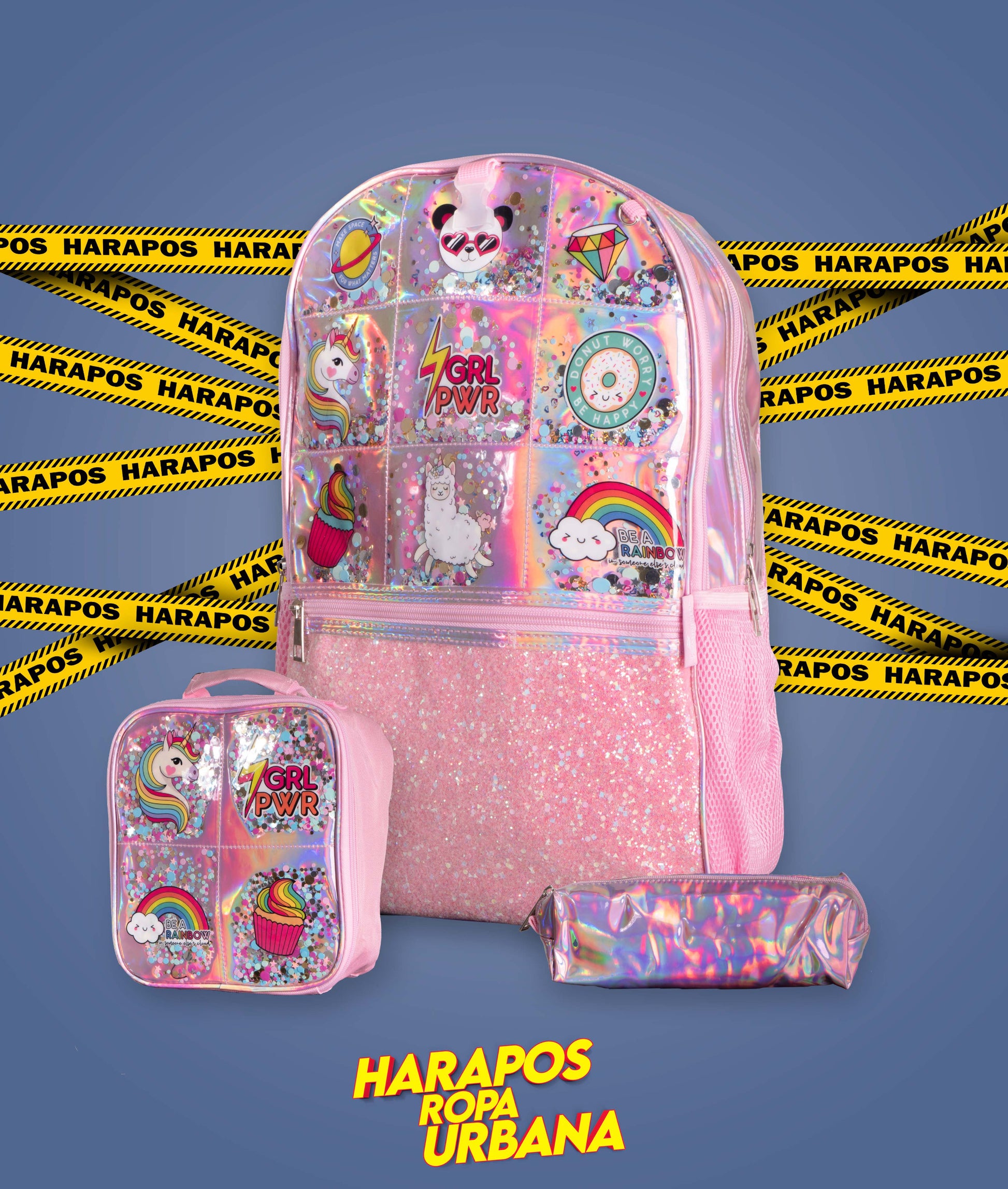 Mochila de niña rosada arcoiris con lonchera y estuche